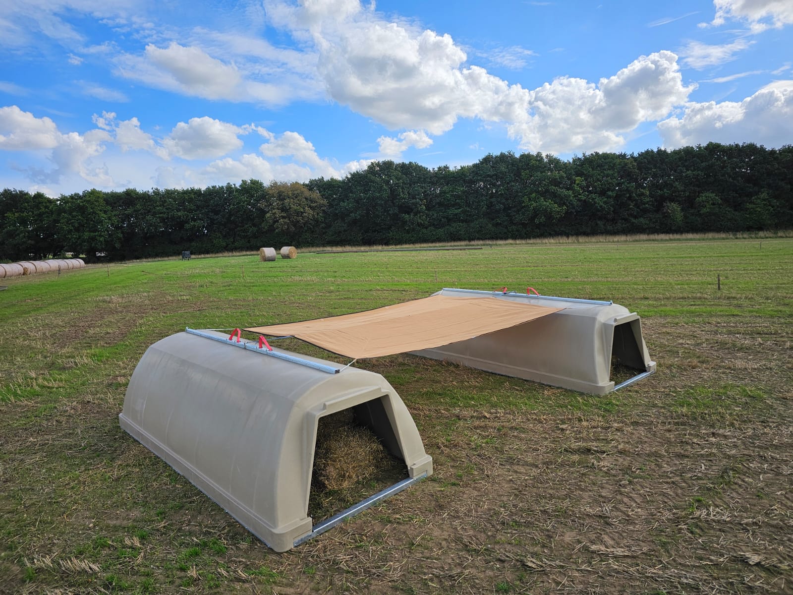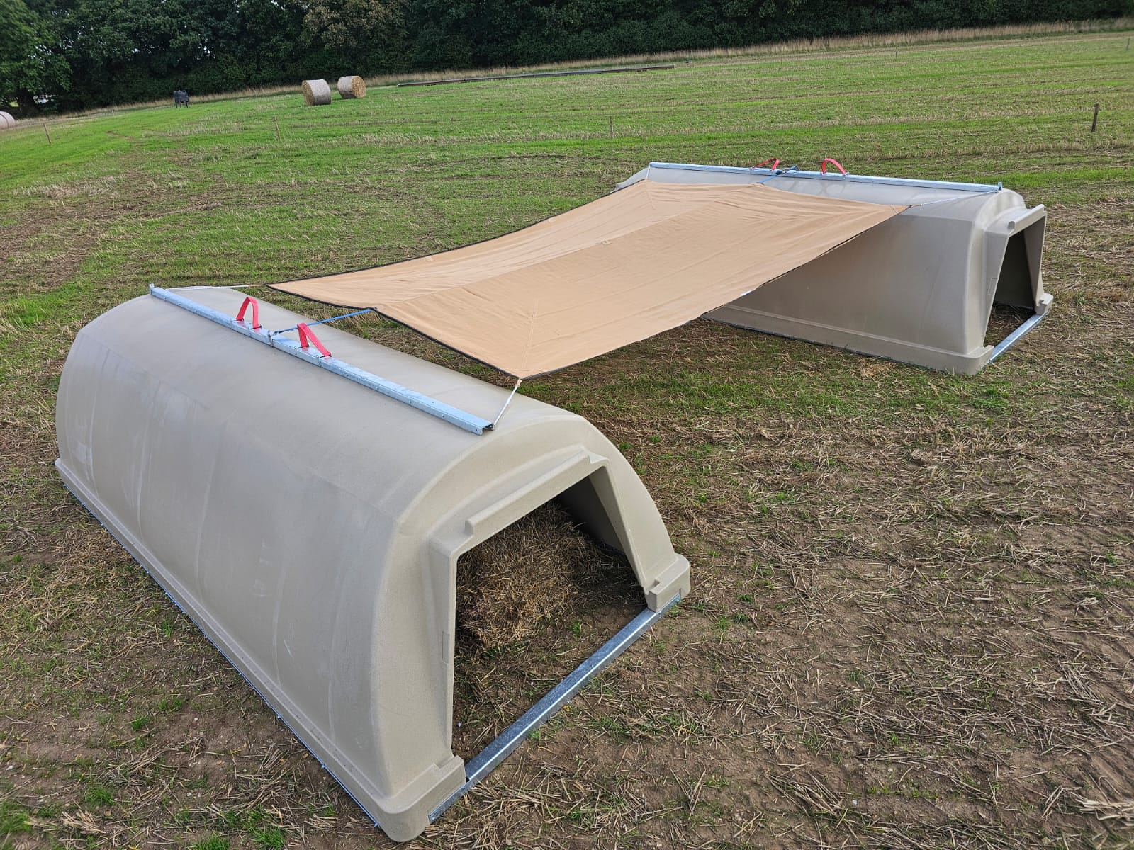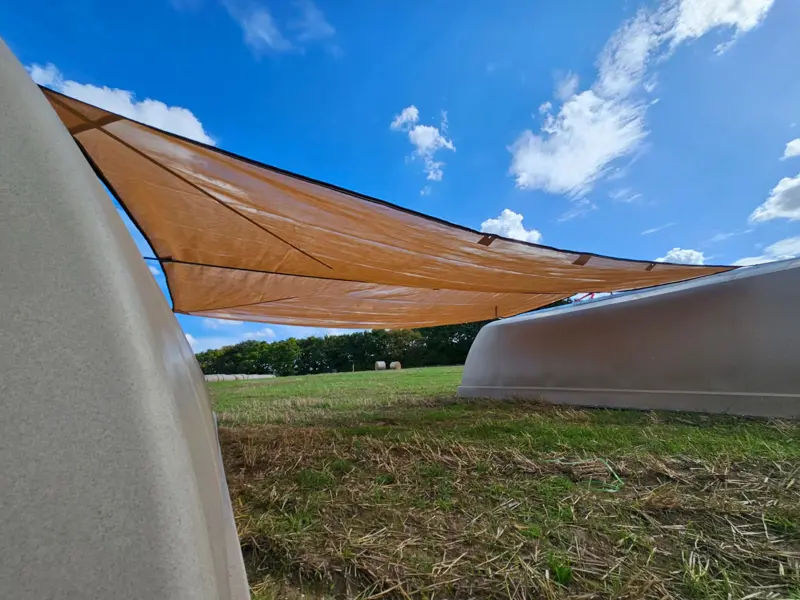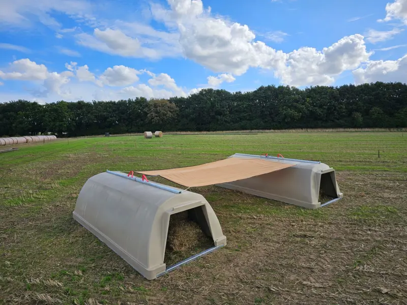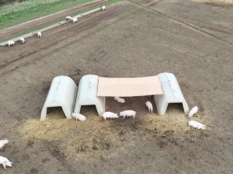 Changing weather patterns have renewed the need for effective shade for adult pigs. Using a durable shading fabric anchored between two large dry sow arks, we have developed a low-maintenance, hard-wearing shade structure that creates a generous shaded sleeping area.